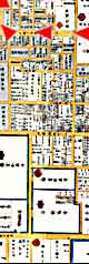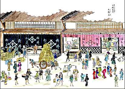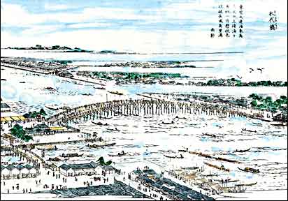 遠回りになるのに、なぜ昌平橋をわたったかは不明。御成街道を真直ぐに行けば筋違(すじかい)橋(現・万世橋)のはず。柳原堤から馬喰町馬場(別名・初音の馬場)の西を抜け、 薬研堀を左手にのぞみながら、久松町へ。高砂橋で浜町堀をわたる。浜町堀が隅田川へそそいだあたりが中洲。中洲をはさんで、上手が新大橋、下手が永代橋。横ぎった大門通の西は、木綿問屋がならぶ大伝馬町。たどりついたのは、浜町堀の支流の〔へっつい河岸〕。へっつい屋が多くあったための俗称。 |