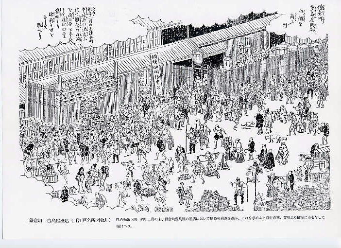 例年二月の末、鎌倉町豊島屋の酒店において雛祭の白酒を商ふ。これを求めんと遠近の輩、黎明より店前に市をなして賑はへり。