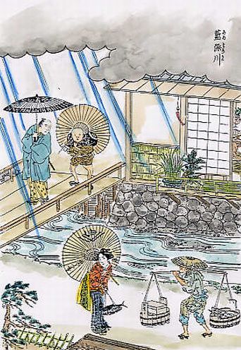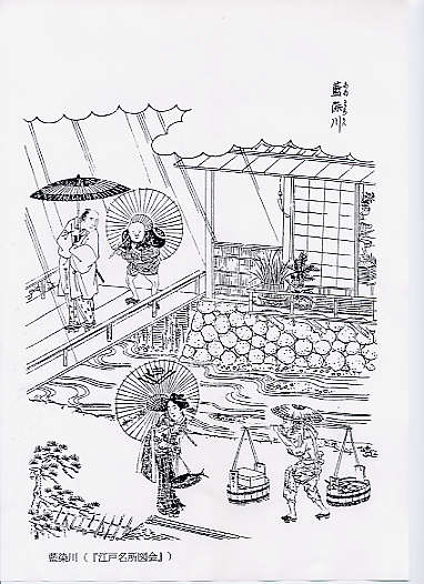 染め上げた生地を屋根の上の櫓のように組んだ干場で、垂れ下がった谷間から街並み、江戸城の物見櫓、そして富士山が見通された有様は風情がある。また雪旦の絵は当に藍染め職人が橋の上で、雨降りで川の流れを心配してる様、引き売りに女性が買い物してる姿も風情があり、この絵を塗りたくなりますね。