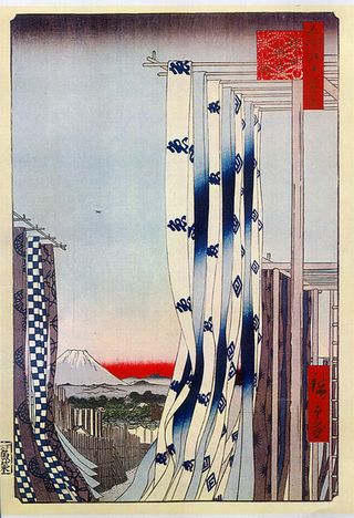 広重は、水色には目もくれず、藍染めを高くかかげ、その先に霊峰を配する。