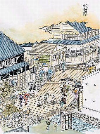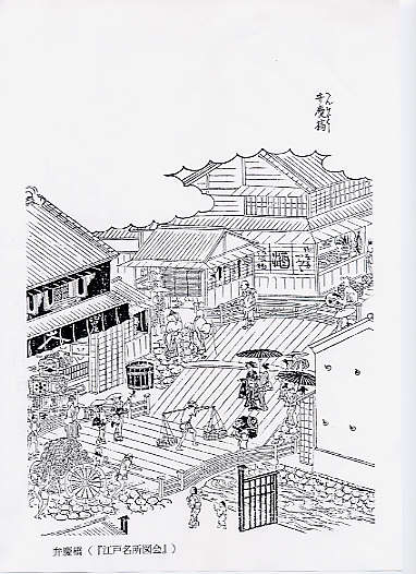 藍染川は、於玉ヶ池を埋め立てたときに出来た水路だそうで、川に架かる弁慶橋は変った橋の形が珍しかったので名所だったとのこと。