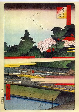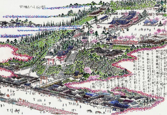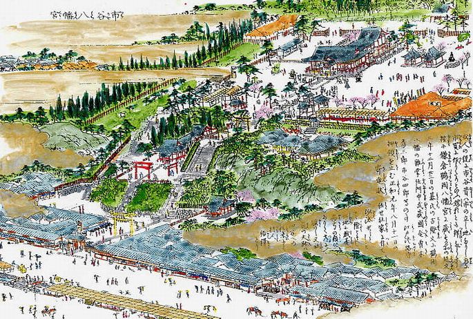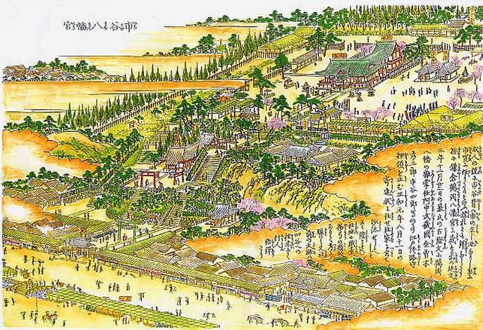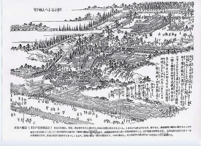 或人の説に、市谷、昔は市の立ちし地なりゆゑに市買ひに作りたりといふ。しかれども詳らかならず。按ずるに、 鎌倉鶴岡八幡宮に蔵するところの延文三年(1358)十二月廿ニ日の(足利)基氏の古証文に、「鶴岡八幡の雑掌任阿(にんあ)申す。 武蔵国金曾木彦三郎・市谷四郎等のこと、江戸淡路守押領を止む。正和元年(1312)八月十一日の寄進状に任せ、 社家に付きて沙汰せらるべし」と云々。証とすべし。社地に儀台(しばい)・楊弓(ようきゅう)の類ありて、つねに賑はし。 また社前の大路は四谷への往来にて行人(こうじん)絡繹(らくえき)たり。