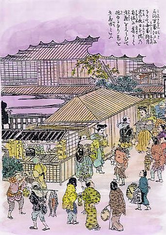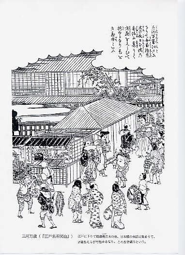 三河万歳、江戸に下りて毎歳極月(しわす)末の夜、日本橋の南詰に集まりて、才蔵をえらびて抱ゆるゆえなり。これを才蔵市といふ。