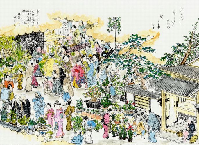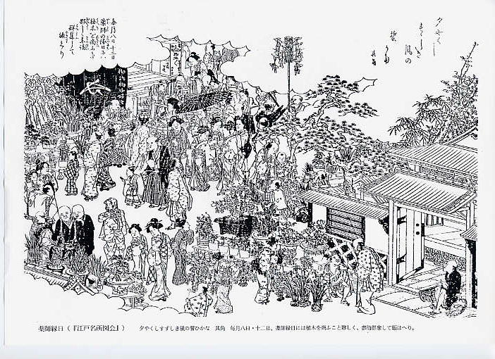 夕やくしすずしき風の誓いかな 其角 毎月八日・十二日、薬師の縁日には植木を商ふこと夥しく、参詣群集して賑はへり。