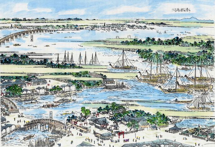 帆船の向こうにみえるのが、長谷川平蔵が設営した石川島の人足寄場。