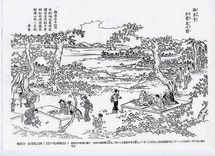 千本の楓樹が深い朱、燃える赤、あざやかな紅色にと酌(く)む盃を染めた。松の緑を背景にした錦繍(きんしゅう)に、東海道第一番目の宿まで足はこんで飲む酒の味も格別。寺号の海晏寺は四海安平の義による。