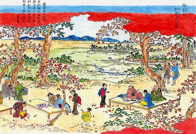 浅黄紅葉、研を競って色とりどりに---『江戸名所花暦』にいう。「品川鮫洲にあり。当山は江府(えど)第一の楓の名所なり」
