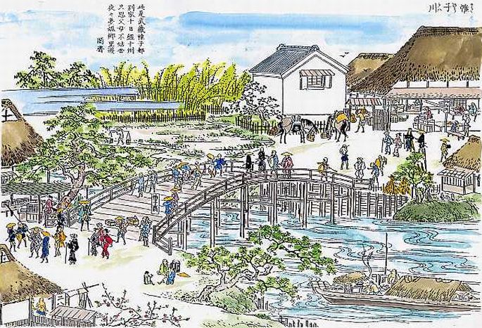 東海道保土ケ谷宿の帷子川河口には,船着場があり,潮の干満を利用した舟運の拠点として商人が薪や炭を江戸方面へ送るなど賑わいを見せています。