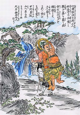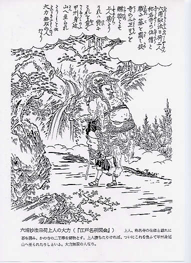 上人、称名寺の住僧と戯れに碁を囲み、かの寺の二王尊を賭物とす。上人勝ちたりければ、 ついにこれを負ふて甲州身延山へ至られたりしといふ。大力無双の人なり。