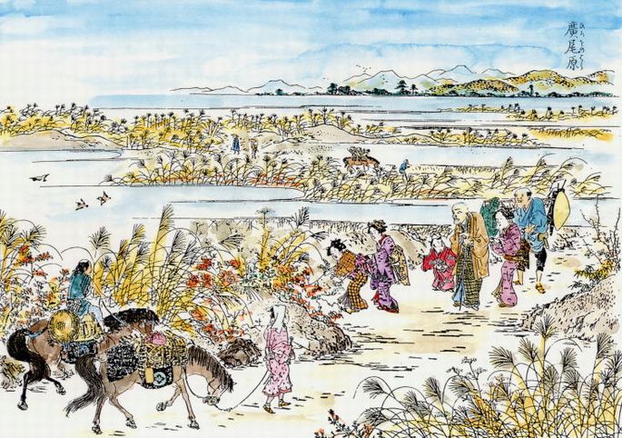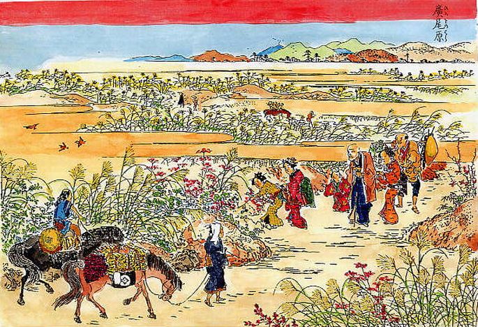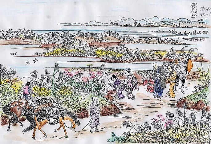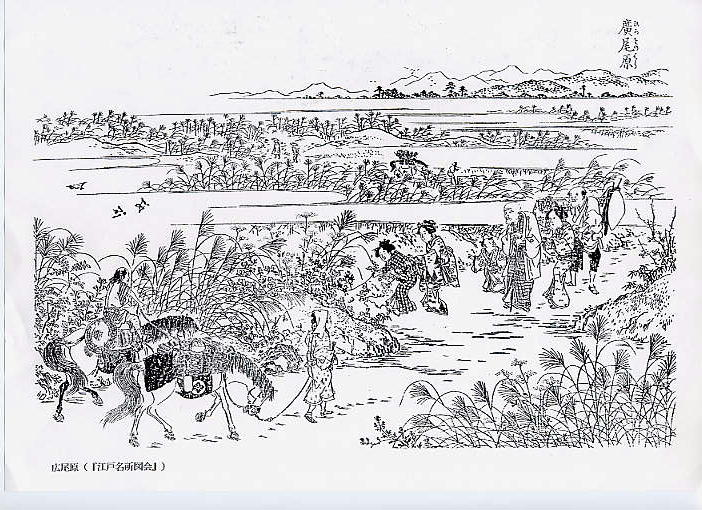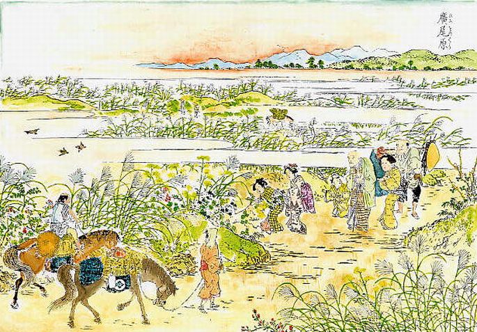 澄み切った秋の日の光景。 町家の旦那と娘さんやお内儀、子供の一家があきの一日を、草花摘みや、虫狩りを楽しんでいる。 近在の農夫が仕事を終えて帰る馬の鞍には5合徳利がゆれている。長閑な光景である。名所図会の中で好きな絵です。