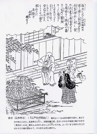 篠寺といへるは四谷塩町の通り、道より左の傍らにあり。長善禅寺と号く。昔御放鷹の頃、 当寺いささかの庵室にて満庭小篠のみ所せく繁茂せしかば、篠寺とよばせたまひしより字(あざな)となりぬ。 よっていまも堂前に方三尺ばかりの小篠の隈(くま)ありて、その証を永世に標せり。