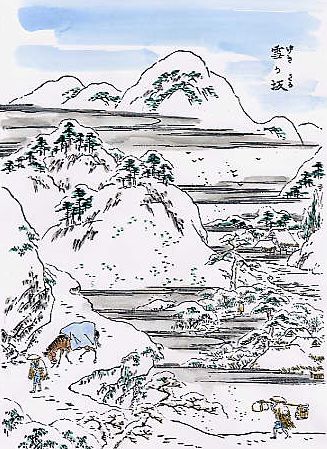 雪の晴れ間に、降り積もった山道を 重い荷物を背に行く馬の雰囲気、とてもよく感じられます。 特に黄色の覆いに若馬の逞しさが出ているような。