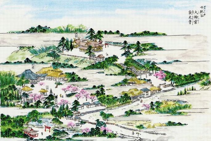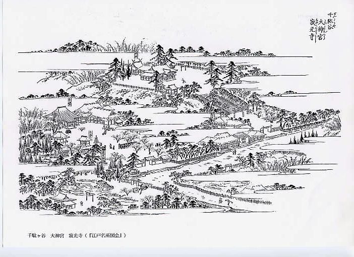 寂光寺が麹町からこの地へ移されたときはあたりは広野で、境内の巨松(左下に注記)は、 かつての奥州街道から遠く見渡せたゆゑに、霞の松と呼ばれていた。寛永(1624~44)のころ、家光がこの地で放鷹したとき、愛鷹「遊女」 が翦(そ)れたために機嫌を損じたが、この松に留まったのちに家光の拳(こぶし)へ戻った。以後「遊女の松」と号(なづけ)られたというが、 いまも、ありやなしや。