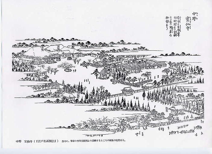おっべさん、ご投稿有り難うございます。そうなんです。宝仙寺ではかなり大きな葬儀がたびたび行われていますので、新聞にも名前がよく出ます。私も数え切れないほど、ここで先輩がたをお見送りさせてもらっています。 実はこのお寺は私にとっては大変懐かしい場所です。小学校4年生まで中野坂上に住んでいましたので、当時の宝仙寺や、塔の山の三重の塔辺りが遊び場でした。三重の塔は私が越した直後の昭和20年5月の空襲で焼け落ちてしまいました。今は中学校になっています。(山手通りの直ぐ右) この三重の塔がいわゆる中野長者が建立したものだと思います。この江戸名所図で見る限り宝仙寺には塔がありませんものね。 象の骨が埋められているとは、この名所図会を見るまではちっとも知りませんでした。交趾国というから今のベトナムですね。いろいろ読み取ることの多い『宝仙寺』です。