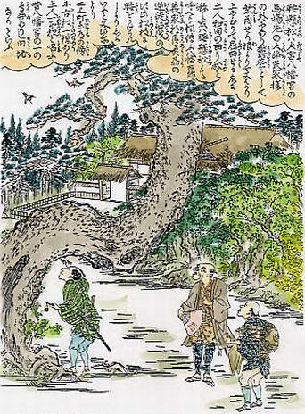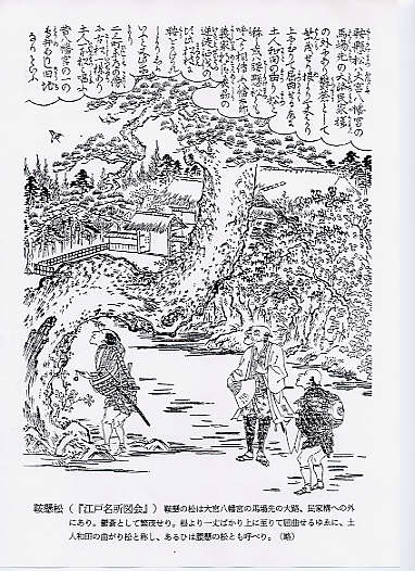 鞍懸の松は大宮八幡宮の馬場先の大路(たいろ)、民家構への外にあり。鬱蒼(うっそう)として繁茂せり。 根より一丈ばかり上に至りて屈曲せるゆゑに、土人和田の曲がり松と称し、あるひは腰懸の松とも呼べリ。相伝ふ。 八幡太郎義家朝臣奥州の逆徒征伐の頃、この松が枝に鞍をかけられしより、しかいふと。また、このところよりニ、三町東、 道の傍らに古松一株あり。土人一本松と唱ふ。昔、八幡宮の一の鳥居ありし旧地なりといふ。