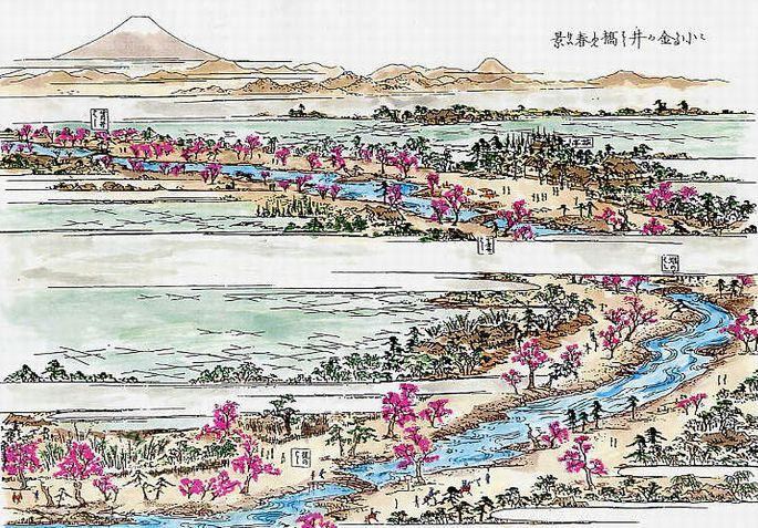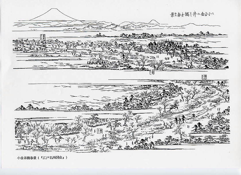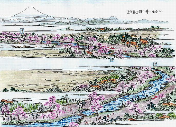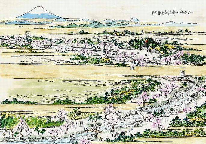 今も昔もお花見名所は健在。 会図の桜並木は田園の中に広範囲に植えられて壮観な眺めであったと思われる。 それぞれ趣きのある塗り方が塗り絵師 のイメージと考えると、毎年々贅沢にお花見をされる「小金井住人さん」の彩色は 現在の満開どきを塗っているのかしら?