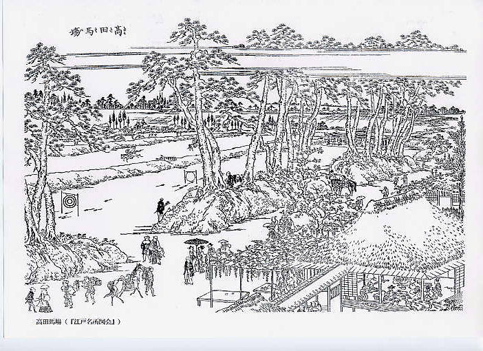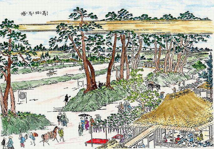 「江戸随一の高田馬場には真ん中に細長い土手が築いてあって、その周囲をぐるぐまわって馬を責めるようになっている。