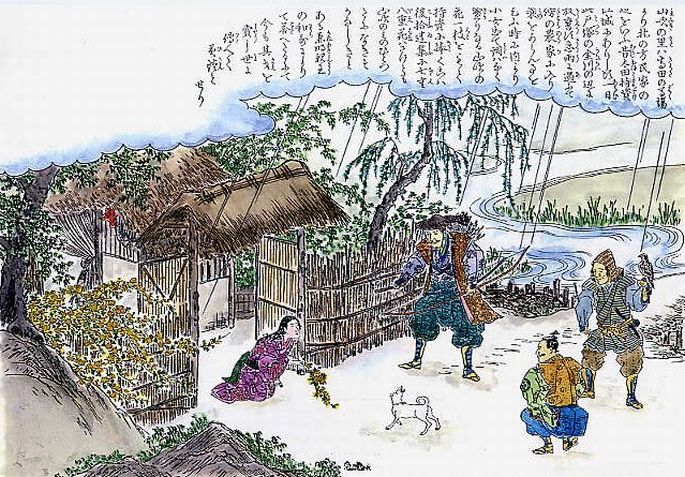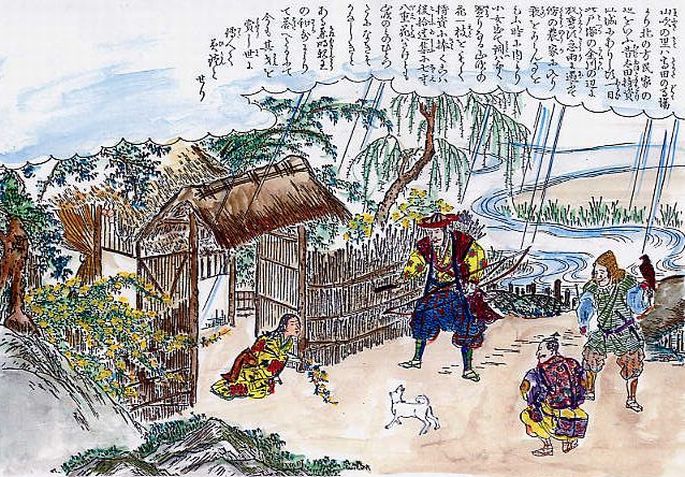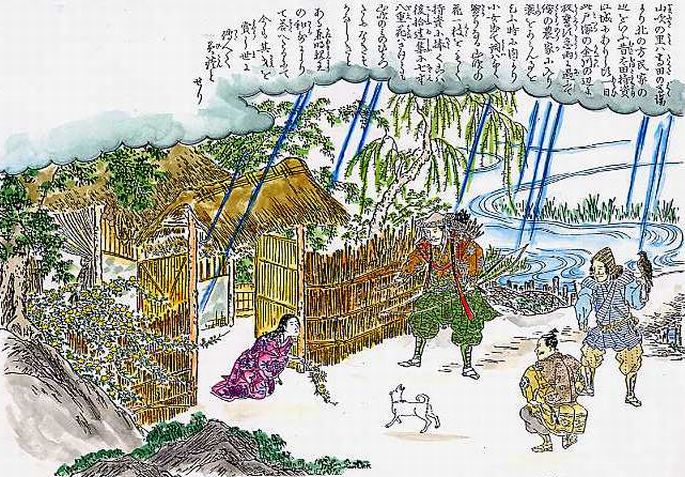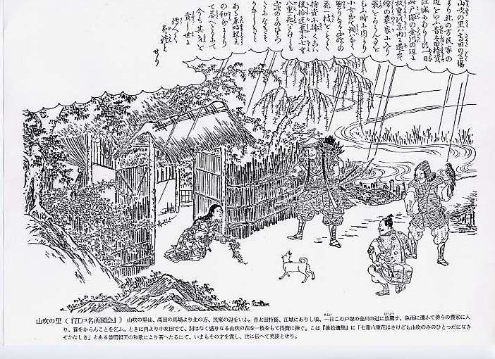 山吹の里は、高田の馬場より北の方、民家の辺をいふ。昔太田持資、江城にありし頃、一日(あるひ)この戸塚の金川の辺に放鷹す。 急雨に遇ふて傍らの農家に入り、簑をからんことを乞ふ。ときに内より小女出でて、詞はなく盛んなる山吹の花一枝をもて持資に捧ぐ。こは 『後拾遺集』に「七重八重花はさけども山吹のみのひとつだになきぞかなしき」とある兼明親王の和歌によりて答へたるにて、 いまもその才覚を賞し、世に伝へて美談とせり。