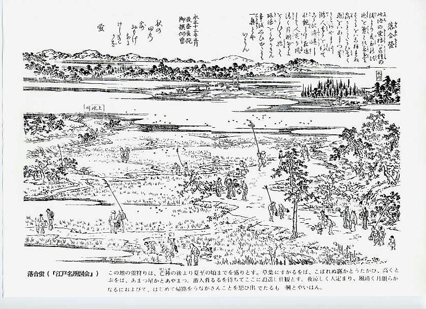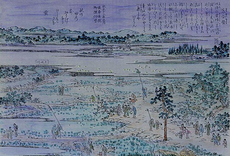 この地の蛍狩りは、芒種(ぼうしゅ)の後より夏の頃までを盛りとす。草葉にすがるをば、こぼれぬ露かとうたがひ、高くとぶをば、 あまつ星かとあやまつ。游人く暮るるを待ちてここに逍遥し壮観とす。夜涼しく人定まり、風清く月朗らかなるにおよびて、 はじめて帰路をうながさんことを思ひ出でたるも一興とやいわん。永正十三年(1516)正月、後奈良院御撰『阿曾(あそ)』 秋の田の露おもげなるけしきかな 蛍