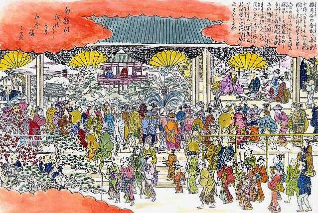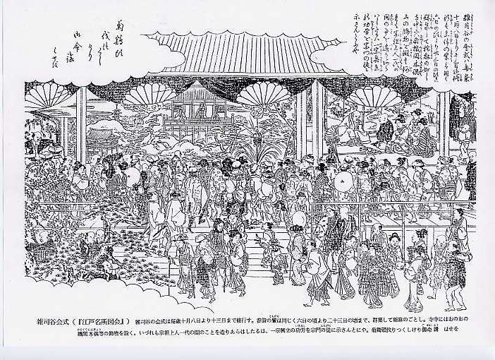 雑司谷の会式は毎歳十月八日より十三日まで修行す。参詣の輩は同じく六日の頃より二十三日の頃まで、群集して稲麻のごとし。 寺中にはおのおの機関木偶等の飾物を設く。いづれも宗祖上人一代の間のことを造りあらはしたるは、一宗興立の功労を宗門の徒に示さんとにや。
