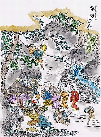 右大臣頼朝卿これを伝へ聞きたまひ、懇請しきりなり。秀衡(略)将軍の厳命黙止(もだし)がたく、速やかに承諾し、蓮輿(れんよ) を装飾(よそお)ひ、(略)鎌倉へ送りまゐらせんとする途中、武州府中の辺りに至りけるに、蓮輿大盤石(だいばんじゃく) のごとくにしてさらに動くことなし。
