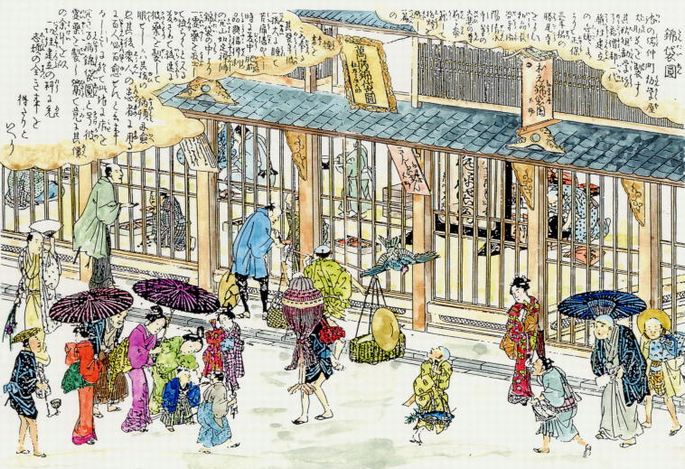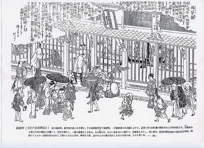 池の端仲町、勧学屋大助これを製す。その始祖勧学坊了翁僧都、一代蔵経建立の志願によりて、正保三年(1648) 摂の勝尾寺および和州長谷寺、清水寺等の大悲の尊前に参籠して、指灯を燃やし、一篇の願書をこめ奉る。その翌(あく)る年、 かの一指おほいに腫れて、苦痛堪えがたし。時に夢中、肥前州興福禅刹の開山如定禅師、錦袋のうちより一霊薬を取り出だして授けらるると見ゆ。 夢覚めて後、速やかにかの薬を服せしかば、その指の病、とみに愈へぬ。その後衆人の患(うれ)ふる者に用ひるに、 百人必ず百癒せずといふことなし。ここにおいて、この地に店を開き、万病錦袋円と号け、かの霊薬を製し鬻(ひさ)ぎてつひにその価(あたえ) の余計をもって一切経建立の料に充て、志願の全きことを得たりといへり。