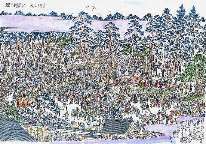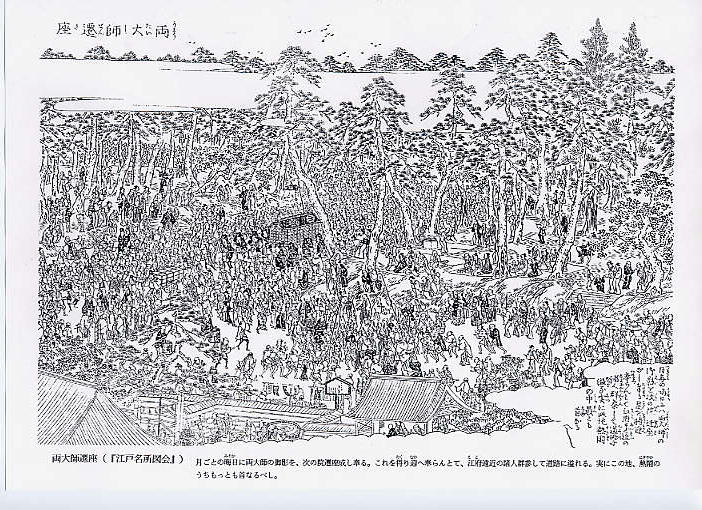 月ごとの晦日(みそか)に両大師の御影を、次の院遷座成し奉る。これを将(おく)り迎へ奉らんとて、江府(えど) 遠近の諸人群参して道路に溢れる。実にこの地、熱鬧(にぎかや)のうちもっとも首なるべし。