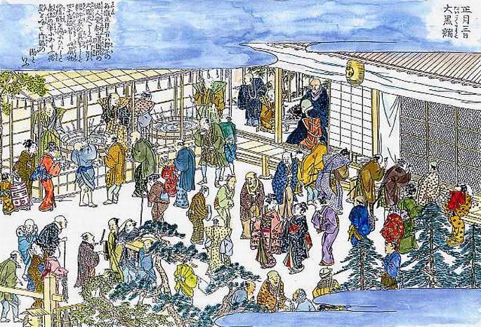 毎歳正月三日は都下の諸人東叡山護国院の大黒天へもうづ。この御影は土佐の信実筆なり。世に霊験著し。 この日供物の鏡餅を湯にひたして参詣の輩(ともがら)にあたふ。俗にこれを呼んで御福の湯といふ。