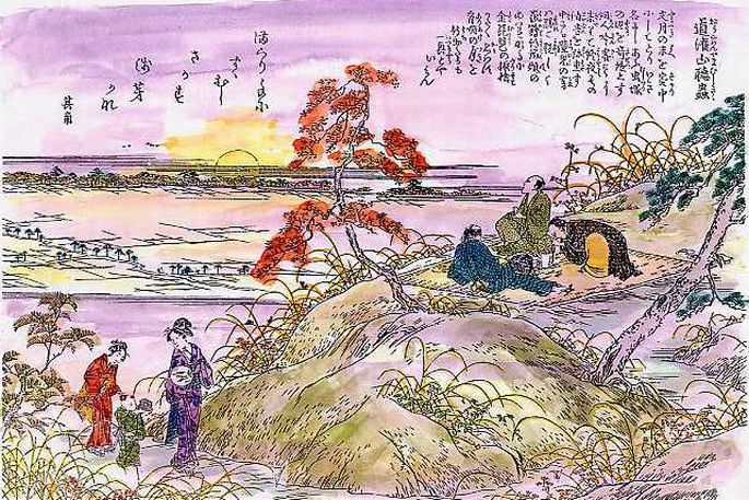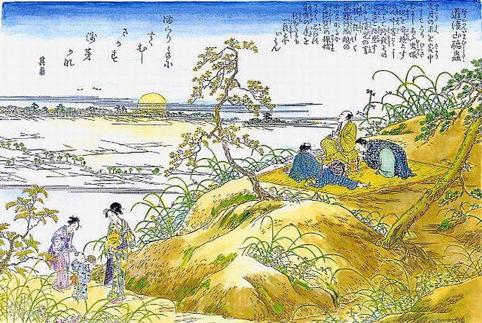 花の名にはそれほど通じていない男性も、幼いころに聴きおぼえた虫の音色は忘れていない。もし、虫たちの合唱会がこの絵のように開かれている場所があれば、秋の宵を、月の出を待ちながら過ごしてみたいとも思うはずである。
