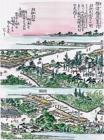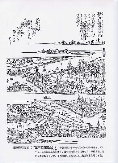 千駄木坂のうへわづかばかりの地をさしていへり。この近辺芸花園多く、庭中四時草木の花絶えず。千駄木坂、旧名を潮見坂ともいひ、 また七面の宮あるゆゑに、七面坂とも号くるといへり。
