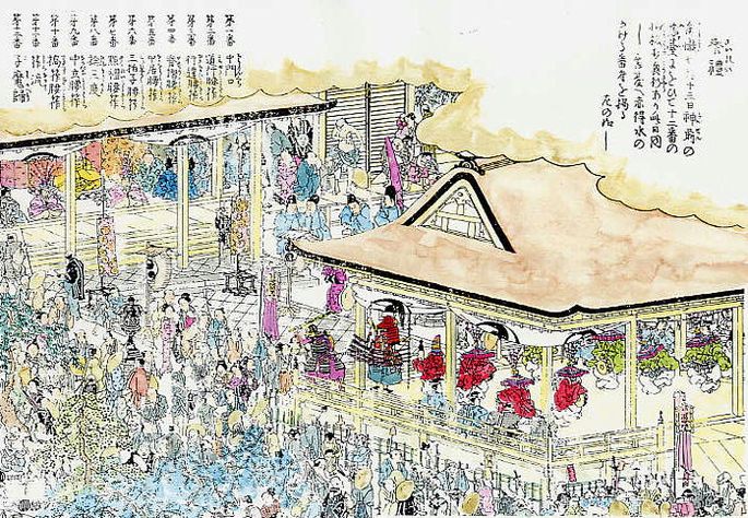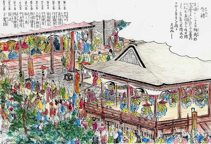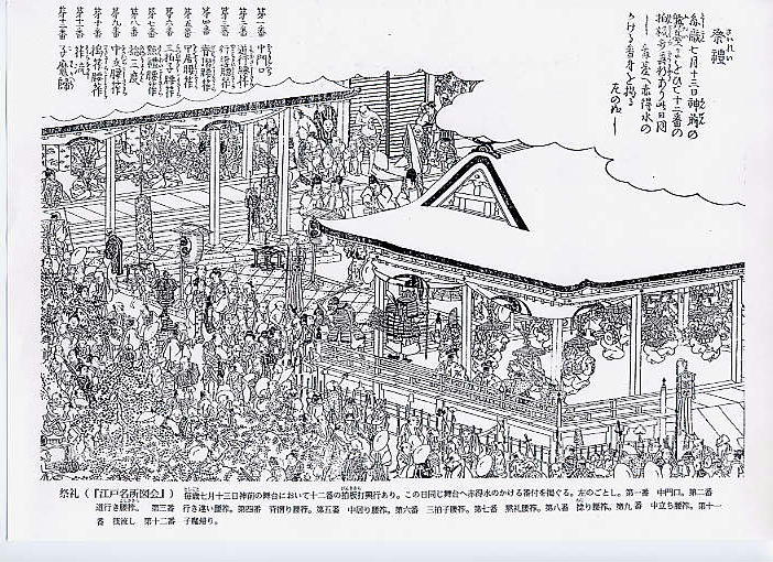 毎歳(としごと)七月十三日神前の舞台に置いて十二番の拍板打(ぴんさらさ)興行あり。この日同じ舞台へ、 赤得水のかける番付を掲ぐる、左のごとし。第一番 中門口。第ニ番 道行き腰筰(こしさらさ)。第三番 行き違い腰筰。第四番 背摺り腰筰。 第五番 中居り腰筰。第六番 三拍子(みつびょうし)腰筰。第七番 目礼腰筰 第八番 捻(ひね) り腰筰 第九番 中立ち腰筰 第十番 搗き腰筰 第十一番 筰流し 第十二番 子魔帰り