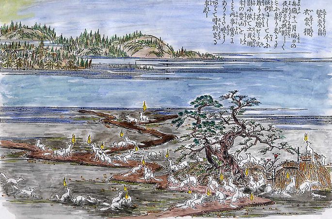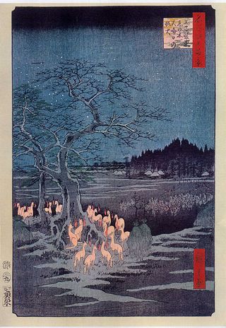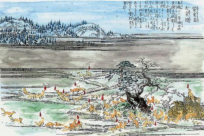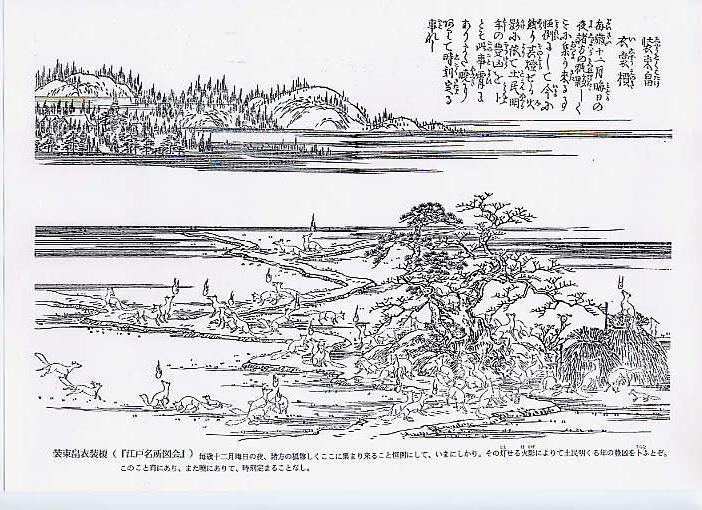 毎歳十二月晦日の夜、諸方の狐夥しくここに集まり来(きた)ること恒例にして、いまにしかり。その灯(とも)せる火影(ほかげ) によりて、土民明くる年の豊凶を卜(うらな)ふとぞ。このこと宵にあり、また暁にありて、時刻定まることなし。