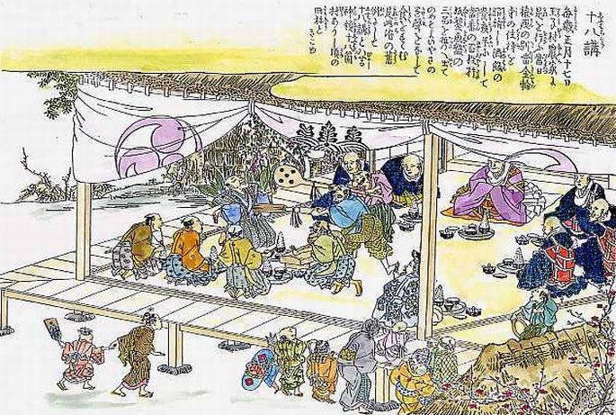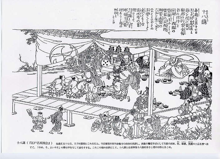 毎歳正月十七日、王子村農家にこれを行ふ。当日権現の別当金輪寺の住持を招請し、酒飯の饗応半ばにして、当番の百姓、杵(きね)、 飯鍬(しゃもじ)、魚盤(まないた)の三品を携え出でて、「のめ、そ、よいやさ」の懸け声をなして食をすすむ。これこの地の旧例にして、 十八講とは昔神領十八箇村ありし頃の旧称ときこゆ。