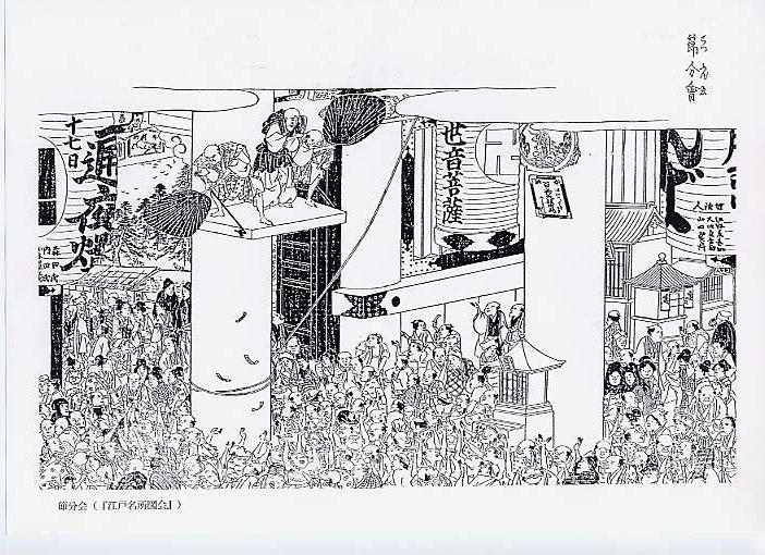 明治になっても寺社で営まれる大衆的節分会は浅草寺だけであった。毎年多少の怪我人が出るので遂に明治17年(鹿鳴館に仮装舞踏会盛行)に明治政府から禁止令がでて廃止となってしまいました。