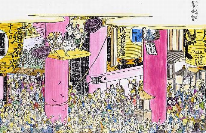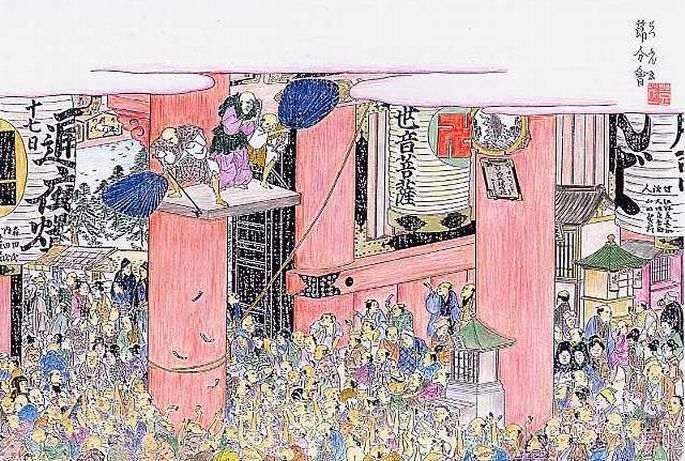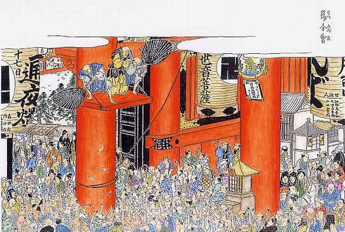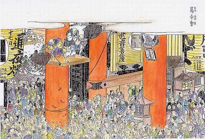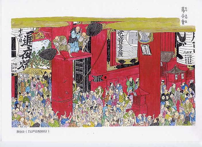 1874年(明治7年)ロンドンで出版された銅版画本で「浅草寺の或るシーン」と見出がついている銅版画はまさにこの長谷川雪旦の節分会そのものです。エイメ・ウンベールがスイス特派公使として日本に来朝した1863年(7月薩英戦争)か64年(8月長州征伐)の風景と思われている。