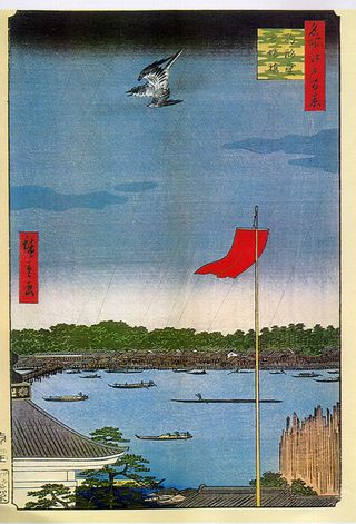 広重は、そこを巧みに避け、赤い旗を高く掲げてすます。旗はじつは、化粧品店〔百助〕の目じるし。その上を鷹が舞う。