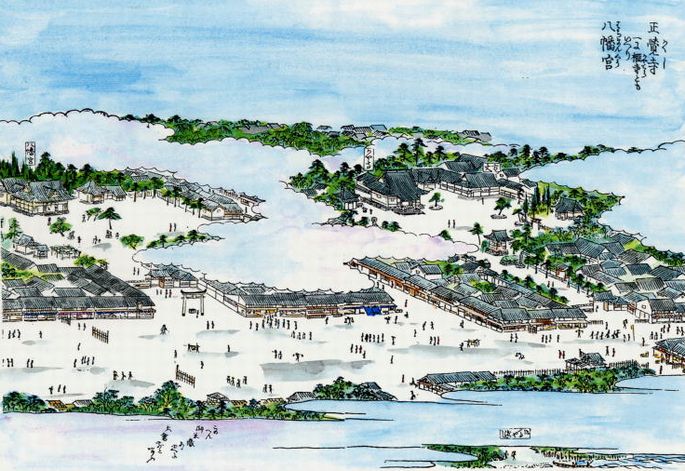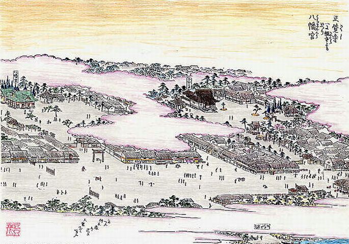 この絵の下側の道を左に行けばすぐ浅草御門、右に行けば雷門である。どうりで行き来する人の数が多い。左下の雲で隠されている辺りが浅草御蔵である。右下にはちらと大川が描かれている。