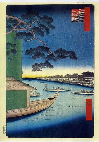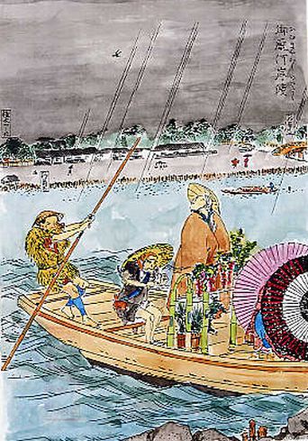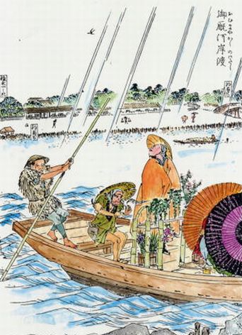 広重:乗舟の2女性は、本所・吉田町からご出勤のいわゆるミズ夜鷹。うしろは牛太郎。
