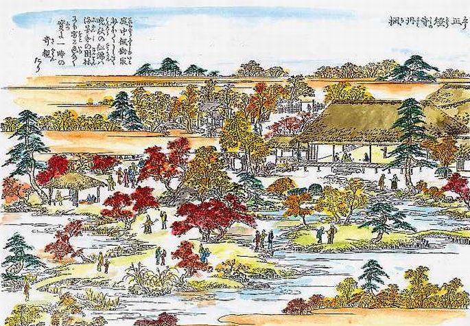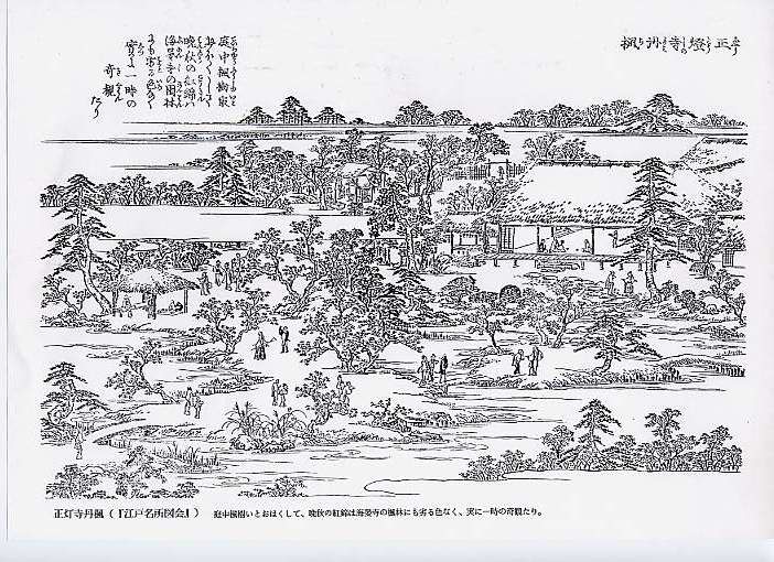 庭中楓樹いとおほくして、晩秋の紅錦は海晏寺の園林にも劣る色なく、実に一時の奇観たり。