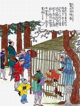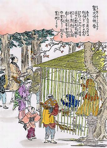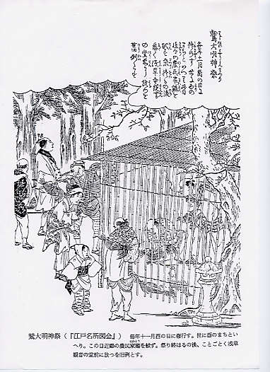 毎年十一月酉の日に修行す。世に酉のまちといへり。この日近郷の農民家鶏(にわとり)を献ず。祭り終はるの後、 ことごとく浅草寺観音の堂前に放つを旧例とす。
