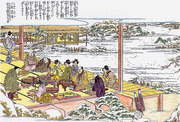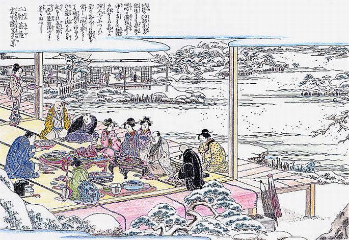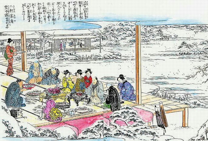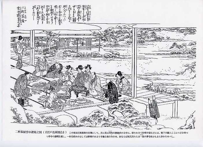 この地は江都東南の佳境にして、月に花に四時(しいじ)の勝趣多かる中に、取りわきて初雪の頃などには、 都下の騒人ここにつどひ来つつ亭中の静閑を賞し、一杯を酌みかはしては酔興のあまり冬籠もる梅の木(こ)の本、秋ならば尾花苅りたき一夜 (ひとよ)の夢を結ぶもまた多かりぬべし。