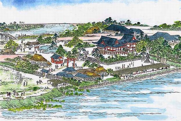 州崎弁才天は元禄13年(1700)に江戸城紅葉山にあった弁天像をこの地に移して祀ったのが始まりという。埋め立てられたばかりの州崎十万石の一番外れの海岸に土地の安寧の願って勧請したものなのだろうか。画面の左には寛政3年(1791)の高潮の後住居を禁じた、いわゆる「波除碑」が見えるが、壊された拝殿も再建され、境内には料理屋や茶屋が建っている。海岸の景勝の地として大いに賑わっていた様子が読み取れる。画面の左上には木場方面へ渡る当時の江島橋が描かれている。今はここは狭い大横川となり、可愛い赤い橋、新田橋が掛かっている。