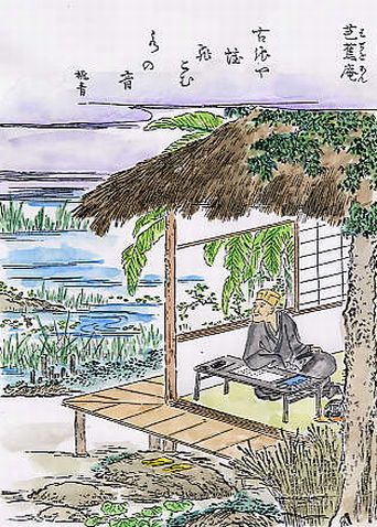 この芭蕉庵の図会をよく見てください。中央に池が描かれ、その池の水面にまさに着水寸前の蛙を描いてます。