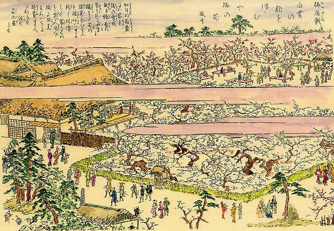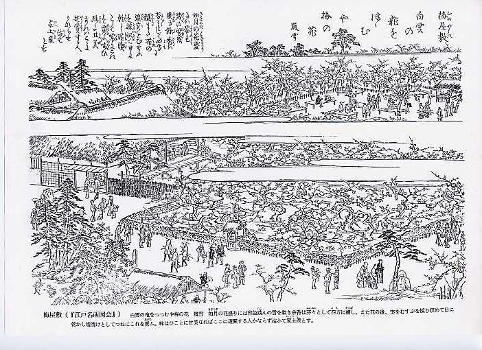 白雲の竜をつつむや梅の花 嵐雪 如月(きさらぎ)の花盛りには容色残(のこ)んの雪を欺き、余香は芬々(ふんぷん)として四方 (よも)に馥(かんば)し。また花の後、実をむすぶを採り収めて、日に乾かし塩漬けとしてつねにこれを賈(あがな)ふ。 味はひことに甘美なれば、ここに遊賞する人かならず沽(こ)ふて家土産(いえづと)とす。