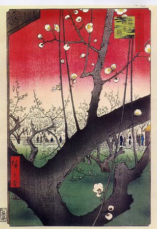 広重は、ごつごつとした古梅の枝ごしに、鑑賞者の姿をとらえる。近遠の構図はすばらしい---が、臥竜は影も形もない。どこの梅園にも通じる景色でしかない。