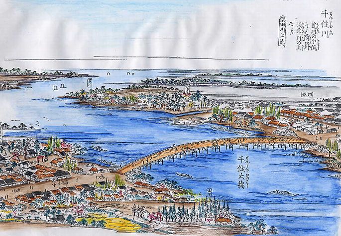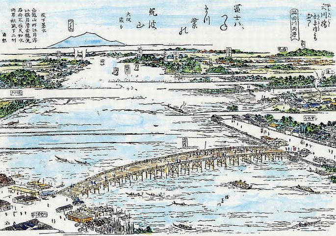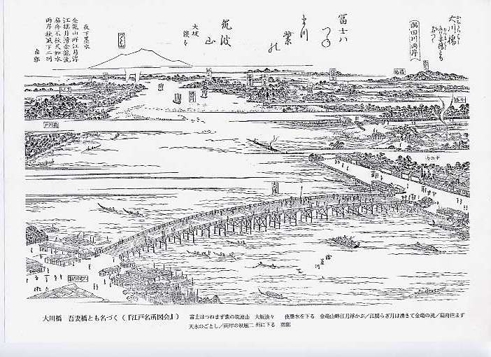 吾妻橋とも名づく。富士はつねまず紫の筑波山 大坂淡々