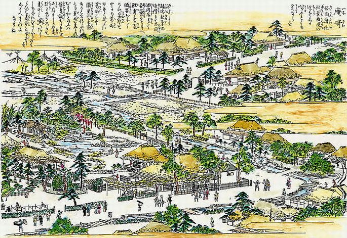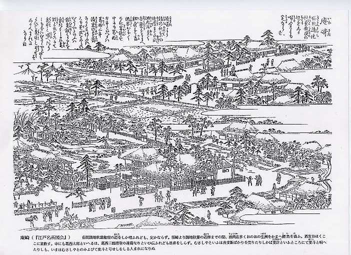 俗間、請地秋葉権現の辺(あたり)をしか唱ふれども定かならず。須崎より請地秋葉の近傍(ちかく)までの間、酒肉店(りょうりや) 多くおのおの籞(いけす)をかまへ鯉魚(こい)を畜(か)ふ。酒客おほくここに宴飲す。中にも葛西太郎といへるは、 葛西三郎清重の遠裔といひ伝ふれども是非をしらず。むさしやといふは、昔麦飯ばかりを売りたりしかば、麦計(むぎばかり) といふここにて麦斗(ばくと)と唱へたりしも、いまはむさしやとのみよびて、麦斗と号せしをしる人まれになりぬ。