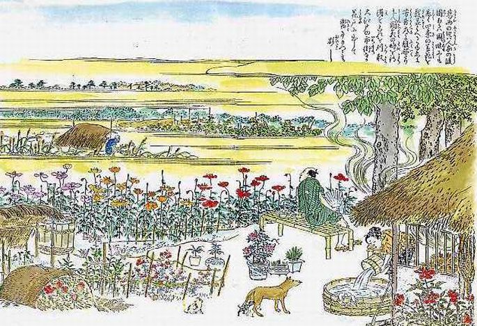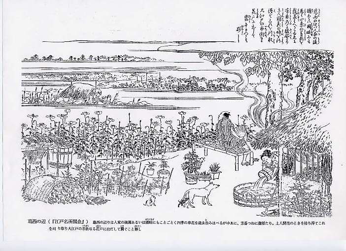 葛西の辺りは人家の後園あるいは圃畦(はたけあぜ)にもことごとく四季の草花を栽ゑ並(な)みはべるがゆゑに、芳香つねに馥郁 (ふくいく)たり。土人開花のときを待ち得てこれを刈り取り大江戸の市街(いちまち)なる花戸(はなや)に出だして鬻(ひさ)ぐこと夥 (おびただ)し。