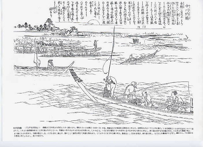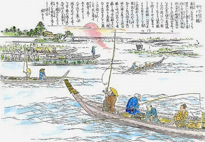 春鱚(はるきす)は三月の末より四月に入りて盛んなり。春釣りといふは寛文(1661~73)の頃、南総(かずさ) 伍大力の船頭仁兵衛をはじめとす。岩崎兵太夫という人これに継ぐ。いま岩崎流といふはすなわちこの人に始まりて、 これより後春鱚を釣ること世に盛んなりしといふ。秋鱚は八月の末より九月なかばを節とす。しかれども、 十月に至り寒気にうつれば沖に出づるがゆゑ川釣りに幸なし。漁人海に産するを白鱚と呼び、川にあるを青鱚と唱ふ。また鱚に大小の差あり。 当歳は腹白く、五、六寸なるを二歳とす。腹すこしく黄色を帯びて背通り黒みあり。七寸より八寸までを三歳と呼ぶ。腹黄色にして赤みを帯び、 背の通り黒し。九寸以上を鼻曲がりと号く。鱗あらし。尺に越ゆるを寒風(さむかぜ)と唱うふるよし、漁人の説なり。