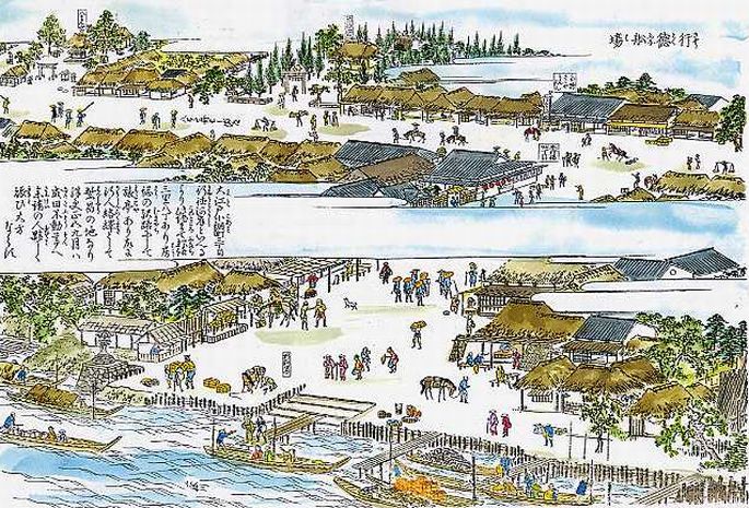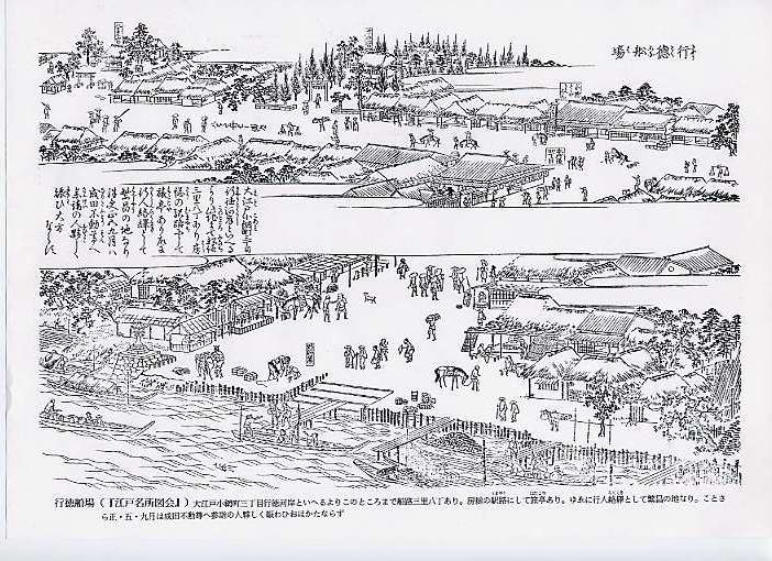 大江戸(えど)小網町三丁目行徳河岸といへるより、このところまで船路三里八丁あり。房総の駅路(うまやじ)にして旅亭(はたごや) あり。ゆゑに行人絡繹(らくえき)として繁盛の地なり。ことさら正・五・九月は、成田不動尊へ参詣の人夥しく、賑はひおほかたならず。